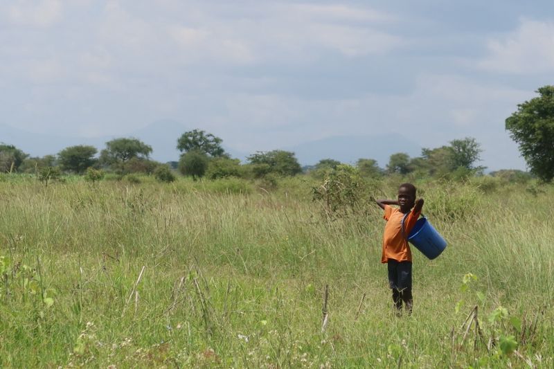 In this powerful image, a young boy walks a long distance across the harsh landscape with a bucket in search of clean water,a daily struggle faced by many children in rural Uganda.